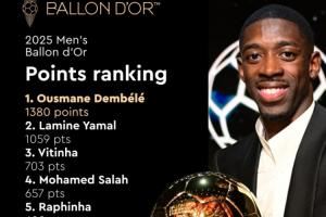 登贝莱1380分第一,第二位亚马尔1059分。登贝莱获得了73张第一选票。